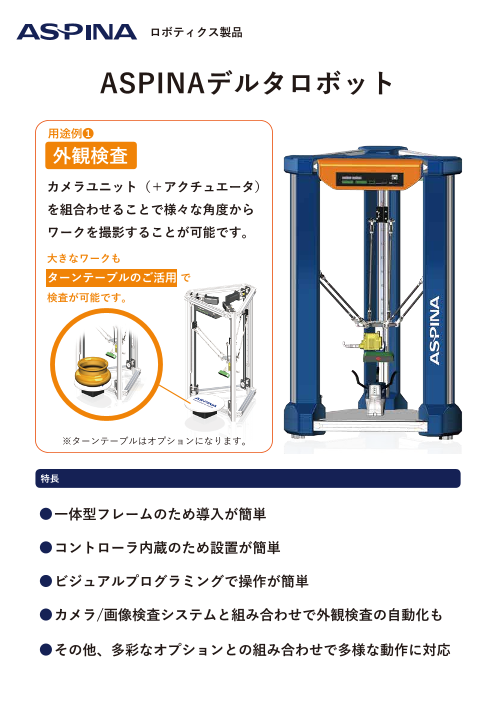 ASPINAデルタロボットは三角形をした可動範囲(デルタ型)の中で動かすことができるパラレルリンク構造のロボットです。 部品や製品の外観検査や接着剤の塗布など、多用途に利用できます。 直感的なソフトウェアで操作が簡単で、ワーク形状や大きさ、角度に応じ...