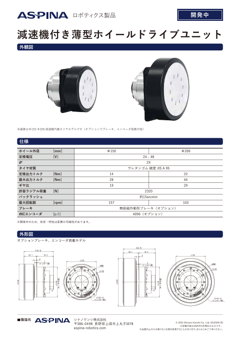 ASPINAの減速機付薄型ホイールドライブユニットは、AMRやAGVに最適な駆動用ユニットです。 粉末鉄心による薄型高効率モータにより薄型でありながら高出力が可能で、 従来のホイールドライブユニットに対し、約半分の長さを実現しました。 また、ブレー...