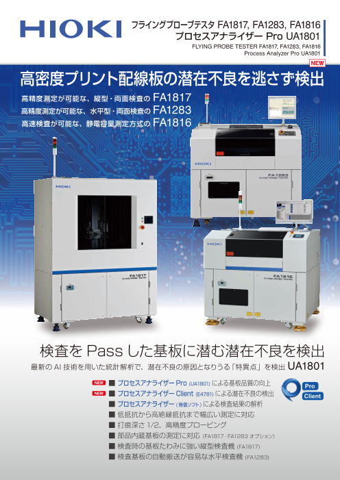 ■共通 ・低抵抗から高絶縁抵抗まで幅広い測定に対応 ・打痕深さ1/2、基板に優しい高精度プロービング(FA1816, FA1817) ・最新のAI 技術を用いた統計解析で、潜在不良の原因となりうる「特異点」を検出 ■FA1816(水平型片面フ...