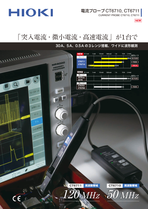 30A、5A、0.5A の3レンジ搭載。ワイドに波形観測できる電流プローブ