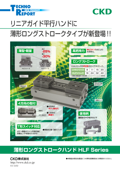 ■薄型&軽量 従来品(HLCシリーズ)と比較して、高さ-25% 重さ-30% ■4方向のボディ取付穴 ■高把持力 Wピストン方式により大把持力