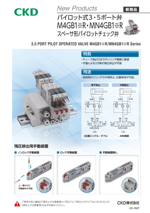 パイロット式3・5ポート弁M4GB1※R・MN4GB1※R スペーサ形パイロットチェック弁は、カンタンに手動で残圧を簡単に抜くことができます。 長時間のシリンダの中間停止や位置保持が可能です。