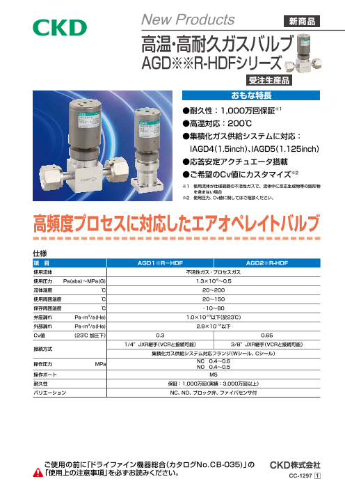 主な特徴 ●耐久性:1000万回保証 ※使用流体が仕様範囲の不活性ガスで、流体中に反応精製物等の固形物を含まない場合。 ●高温対応:200℃まで ●集積化ガス供給システムに対応:IAGD(1.5inch)、IAGD5(1.125inch) ●ご...
