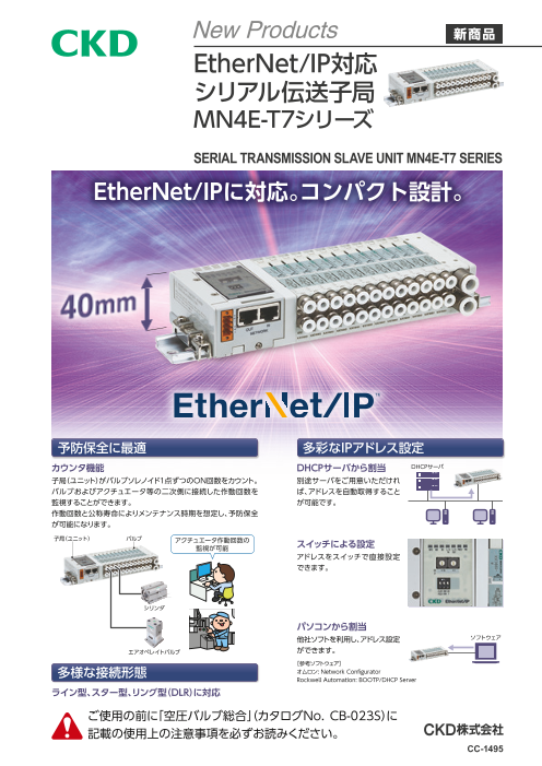 ご好評いただいております「MN4Eシリーズ」に遂にEtherNet/IP対応機種が登場しました。 従来通りカセットタイプで、さらに小形化(高さ39.5mm)を実現した高性能3・4ポートブロックマニホールドです。 【豊富な通信対応】 Ethe...