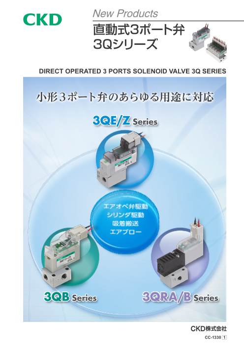 小形3ポート弁のあらゆる用途に対応します。(エアオペレイトバルブ/シリンダ駆動、吸着搬送、エアブローなど) 正圧専用の3QE/Zシリーズ、正負圧用の3QBシリーズ、正負圧用大流量の3QRシリーズがあります。 【適応シリンダ径:Φ6~Φ20】