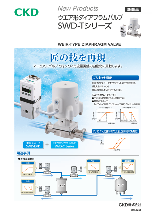マニュアルバルブで行っていた流量調整の自動化に貢献します。任意のパラメータをプリセットメモリに登録可能。アナログ入力信号での流量比例制御にも対応。