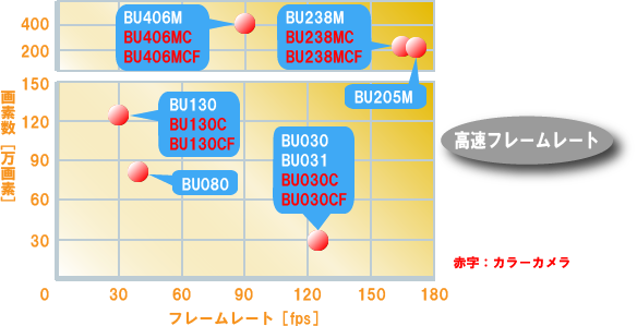 BU030/BU030C/BU030CF/BU031(VGA)は125fps、BU080(XGA)は40fps、BU130/BU130C/BU130CF(SXGA)は30fps、BU406M/BU406MC/BU406MCF(4M)は90fps、BU238M/BU238MC/BU238MCF(2.3M)は165fps、BU205M(2M)は170fpsの高速フレームレートを実現します。