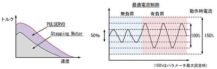 パラメータ設定によってモータ動作(回転)中に流れる電流を、定格の150%まで設定可能です。それにより加減速特性が向上します。